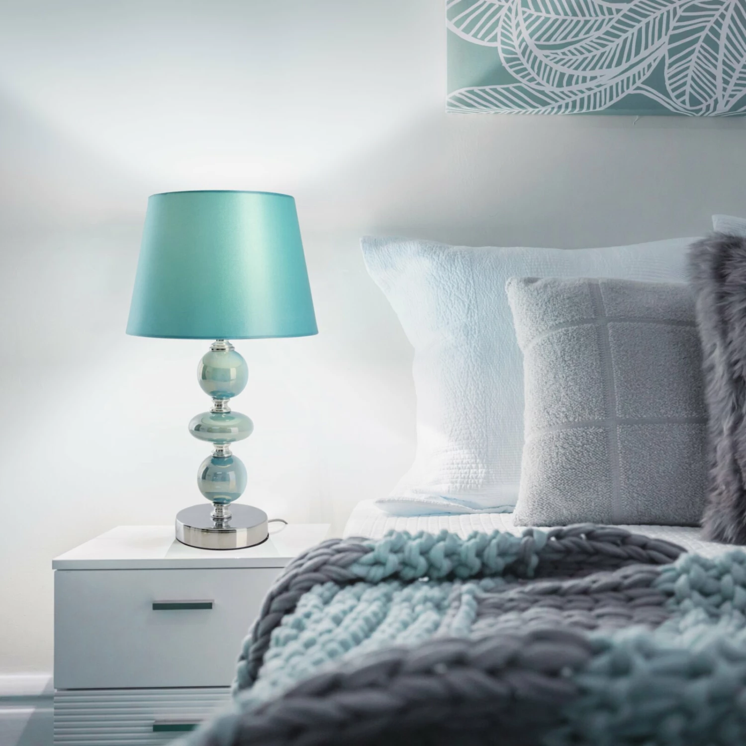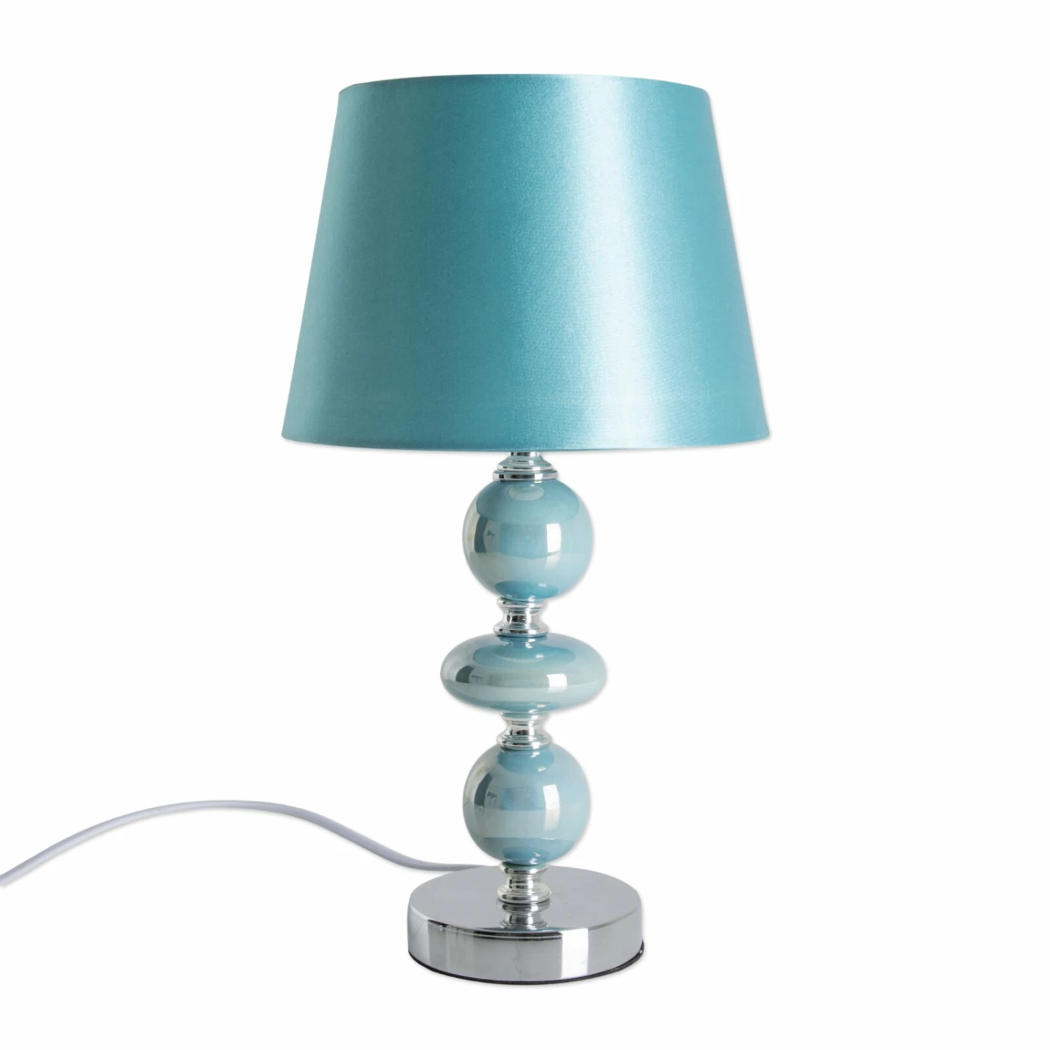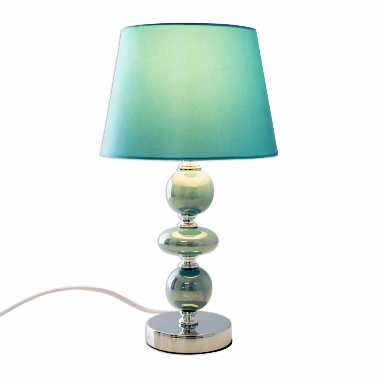 Die türkise Tischleuchte ARAGA aus Keramik sorgt mit ihrer Form und Farbe für einen echten Hingucker, egal in welchem Raum. Eingeschaltet wirft die Leuchte durch den türkisen Satinschirm ein schönes farbiges Licht. Über einen Kippschalter schalten Sie die Leuchte bequem ein und aus.