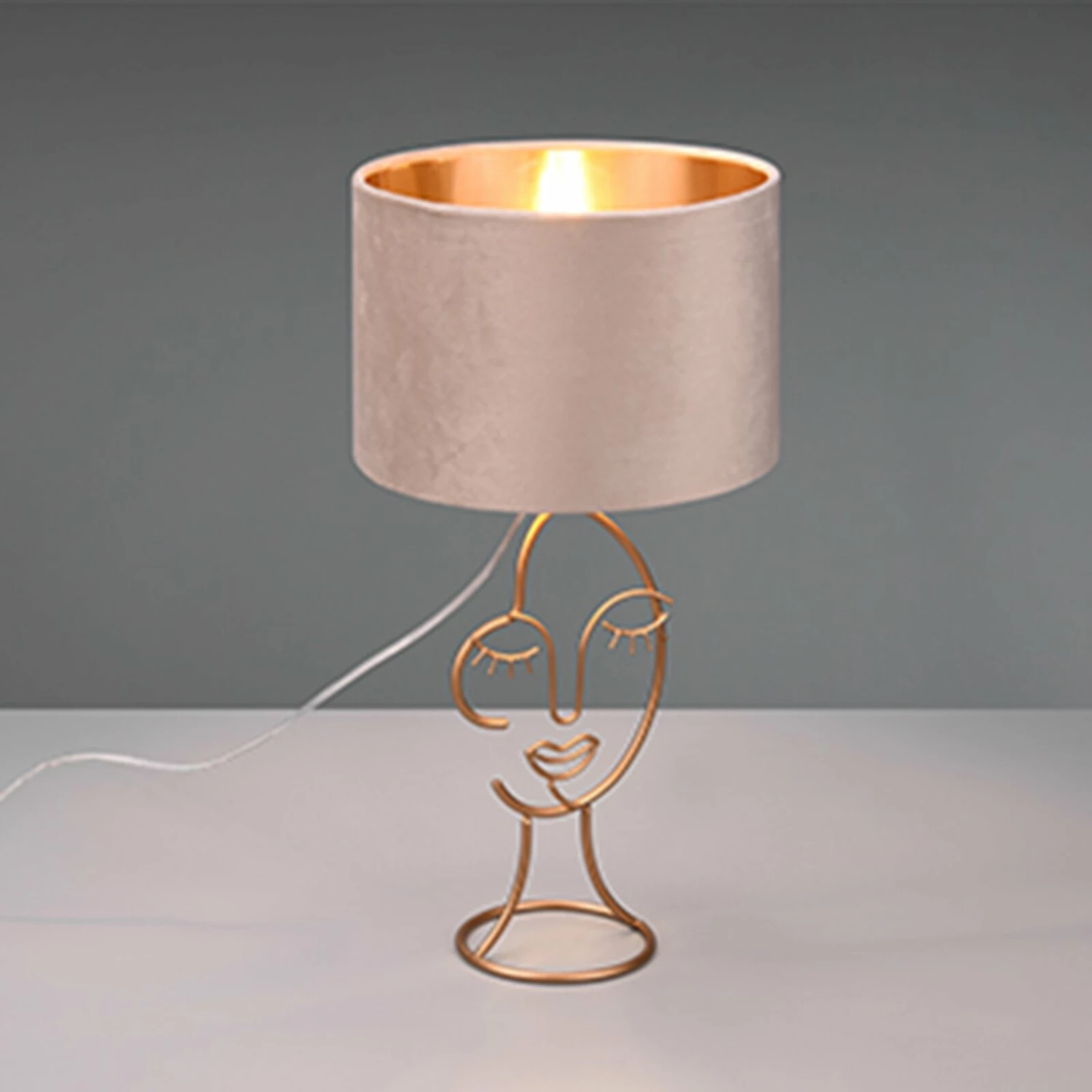 Diese hübsche Tischleuchte ist durch das goldene Gestell mit einer Gesichtsform ein echter Hingucker. Die Lampe besitzt eine Größe von etwa 24 x 42 cm. Ausgestattet ist die Lampe mit einem Samtschirm, der die Lampe edel wirken lässt.