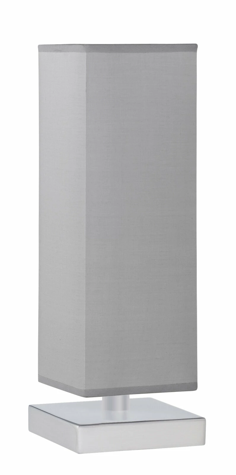 Schicke Tischleuchte in Nickel matt und Hellgrau mit Touchdimmer. Diese Leuchte sieht besonders schick auf Tisch und Fensterbank aus.