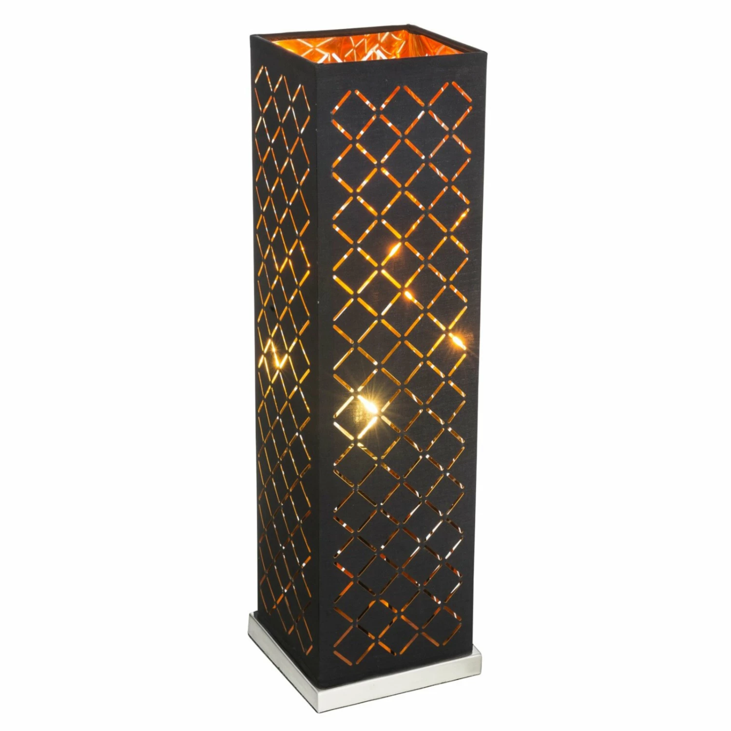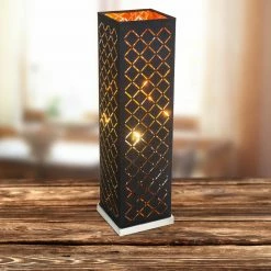 Diese etwa 57 cm hohe Tischleuchte wird zum neuen Hingucker! Die quadratische Leuchte punktet mit seinen Dekorstanzungen, welche für eine angenehme Atmosphäre und leuchtende Akzente sorgen. Die Lichtquelle kann über einen Wippschalter problemlos ein- und ausgeschaltet werden. Die formschöne Leuchte wird mit einem goldfarbenen Leuchtschirm im Inneren abgerundet.