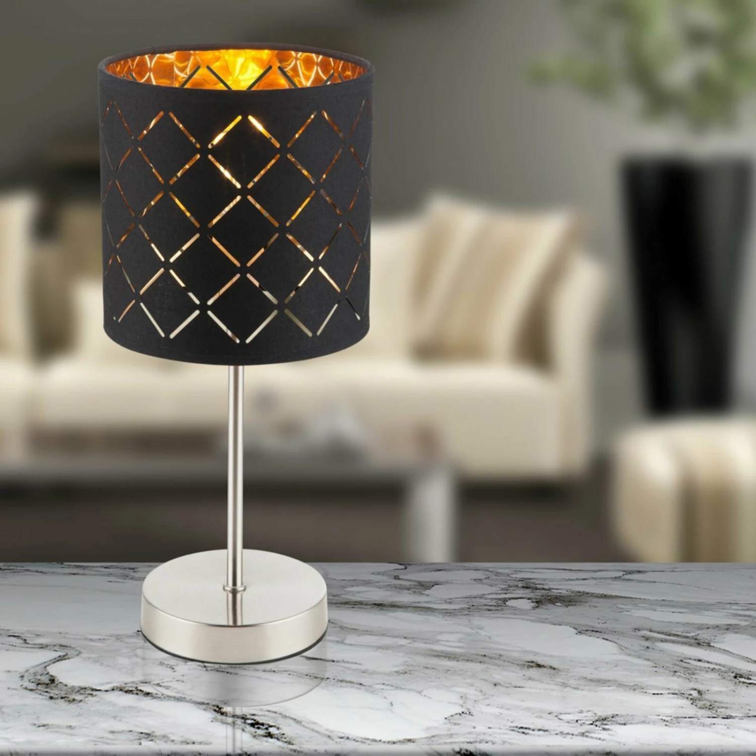 Mit dieser runden Tischleuchte in Schwarz setzt du leuchtende Akzente in deinem Wohnraum. Die Dekorstanzungen und der im Innneren goldfarbene Leuchtschirm machen diese Leuchte zu einem echten Hingucker. Die Lichtqeulle kann über einen Wippschalter problemlos an- und ausgeschaltet werden.