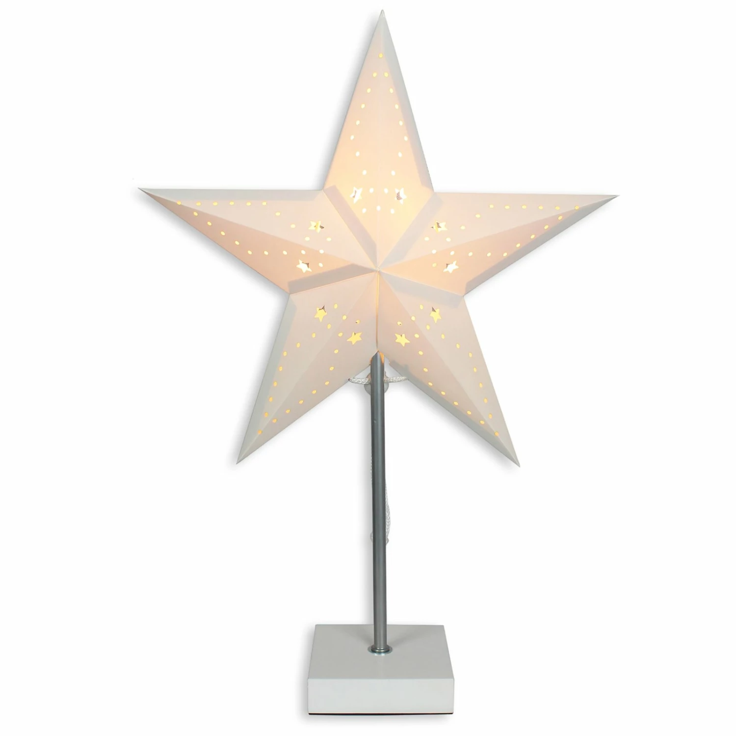 Sternförmige Tischleuchte mit weißem Papierschirm. Diese ungewöhnlich geformte Lampe ist ca. 50 cm hoch und gibt durch die ausgestanzten Sterne und das weiße Papier wunderschönes Licht. Statten Sie sie zum Beispiel mit einer LED-Leuchte aus und sparen Sie Energie.
