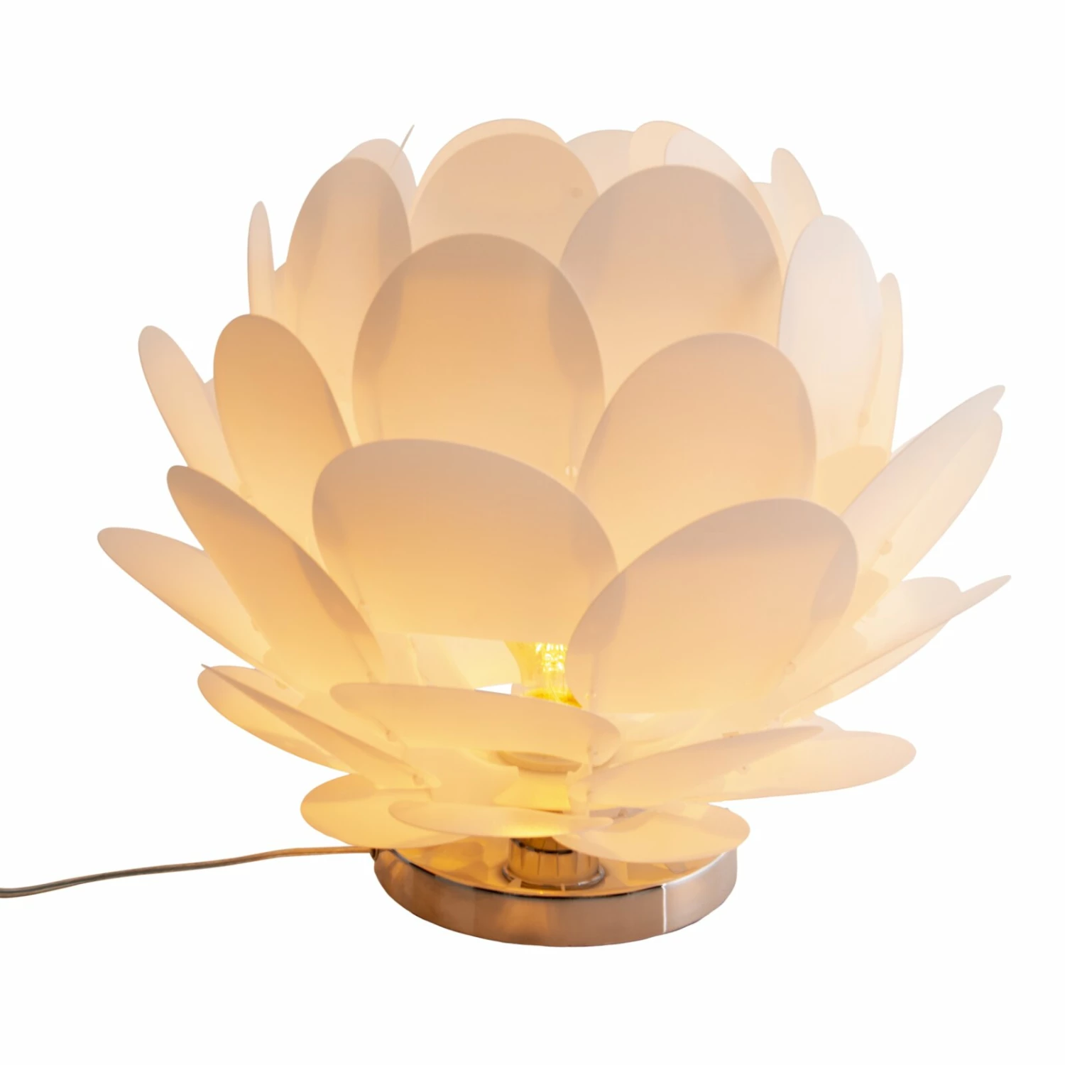 Die Tischleuchte ist in einem floristischen Stil ausgeführt und wird mit einem Kippschalter bedient.