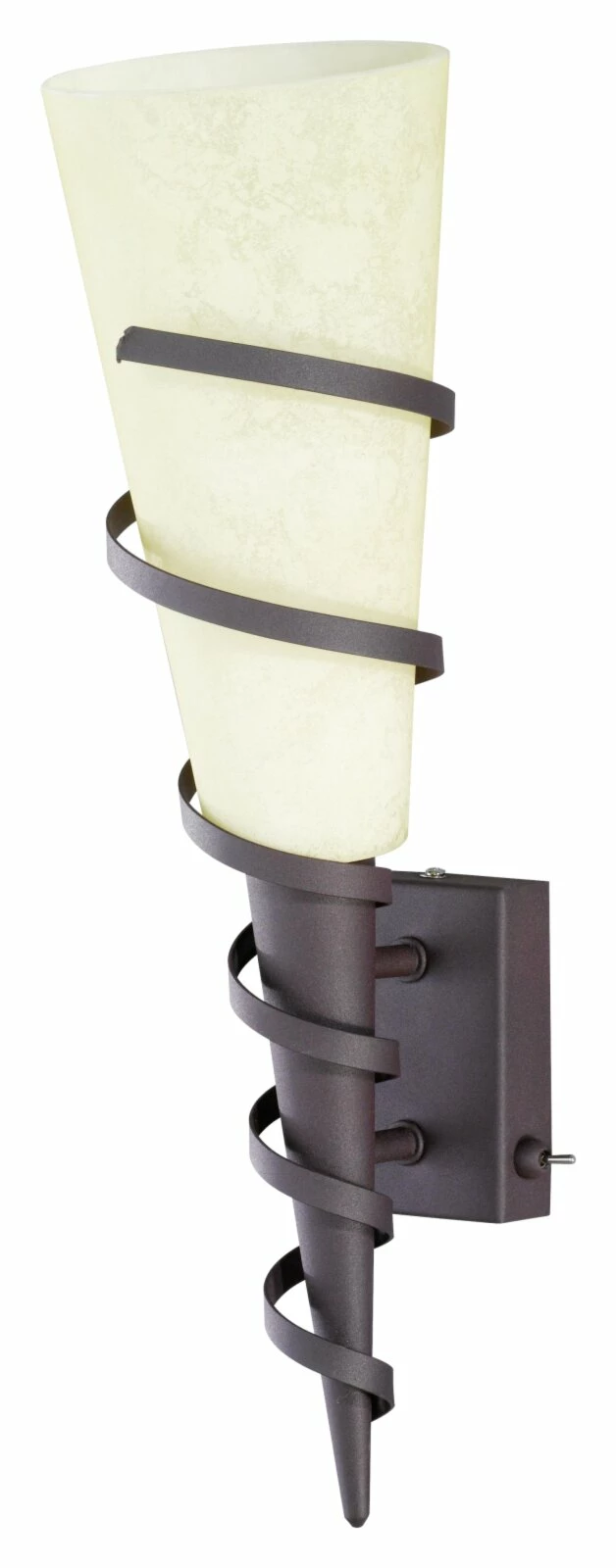 Diese hübsche Wandleuchte erinnert vom Stil her an Fackel – aber modern interpretiert. Das rostfarbige Metall harmoniert dabei wunderbar mit dem marmorierten Glas.