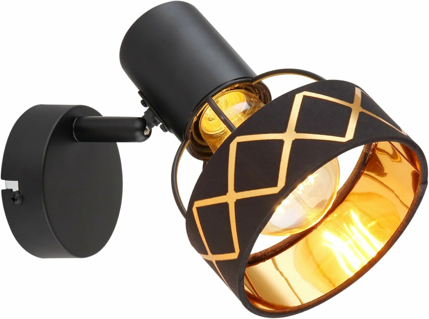 Dieser trendige Wandstrahler kommt mit einer atemberaubenden Farbgebung daher. Das Gestell ist zwar in einem schlichten Schwarz gehalten, der Schirm ist jedoch mit einem goldenen Muster versehen und macht den Wandstrahler zu einem echten Blickfang.