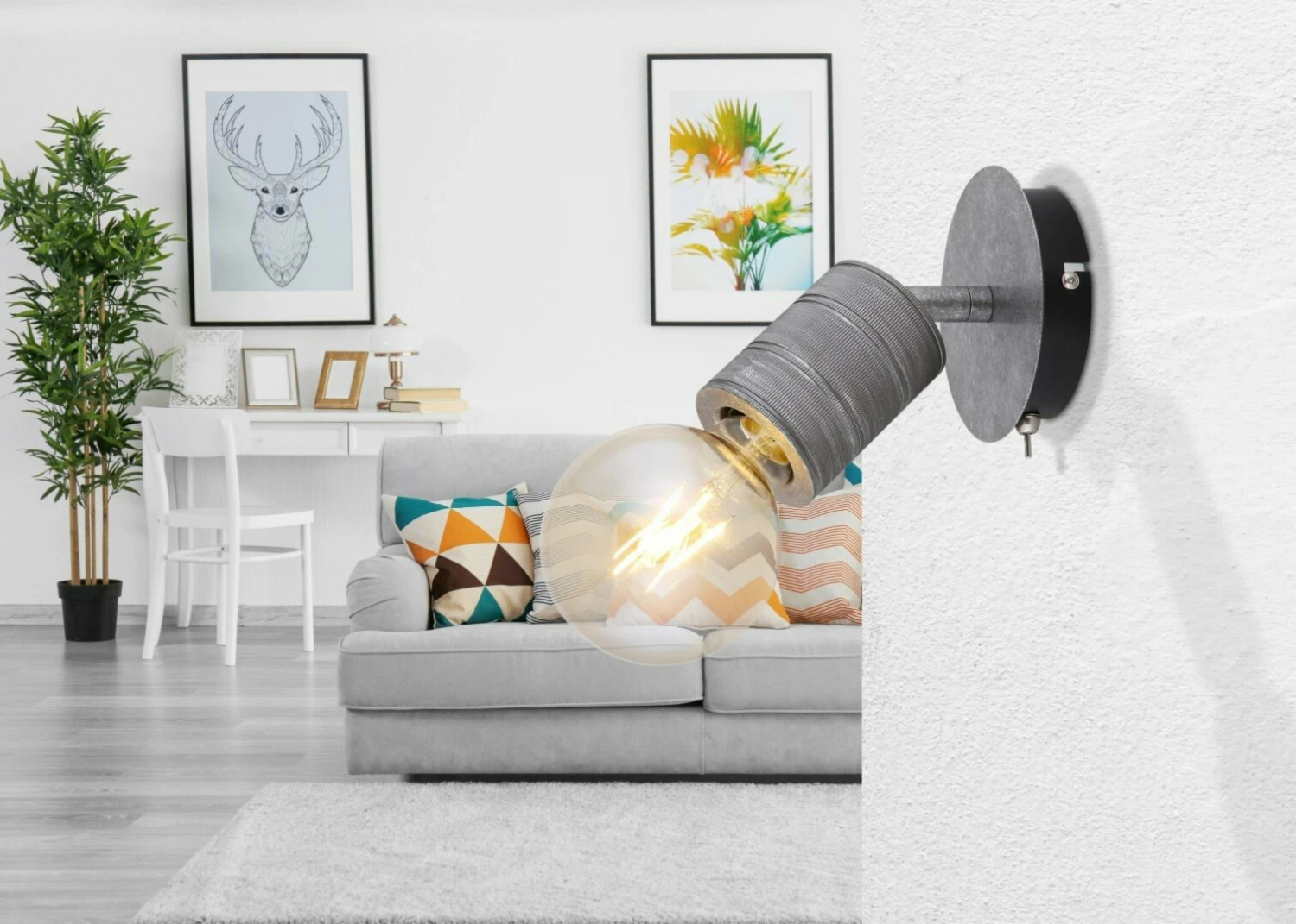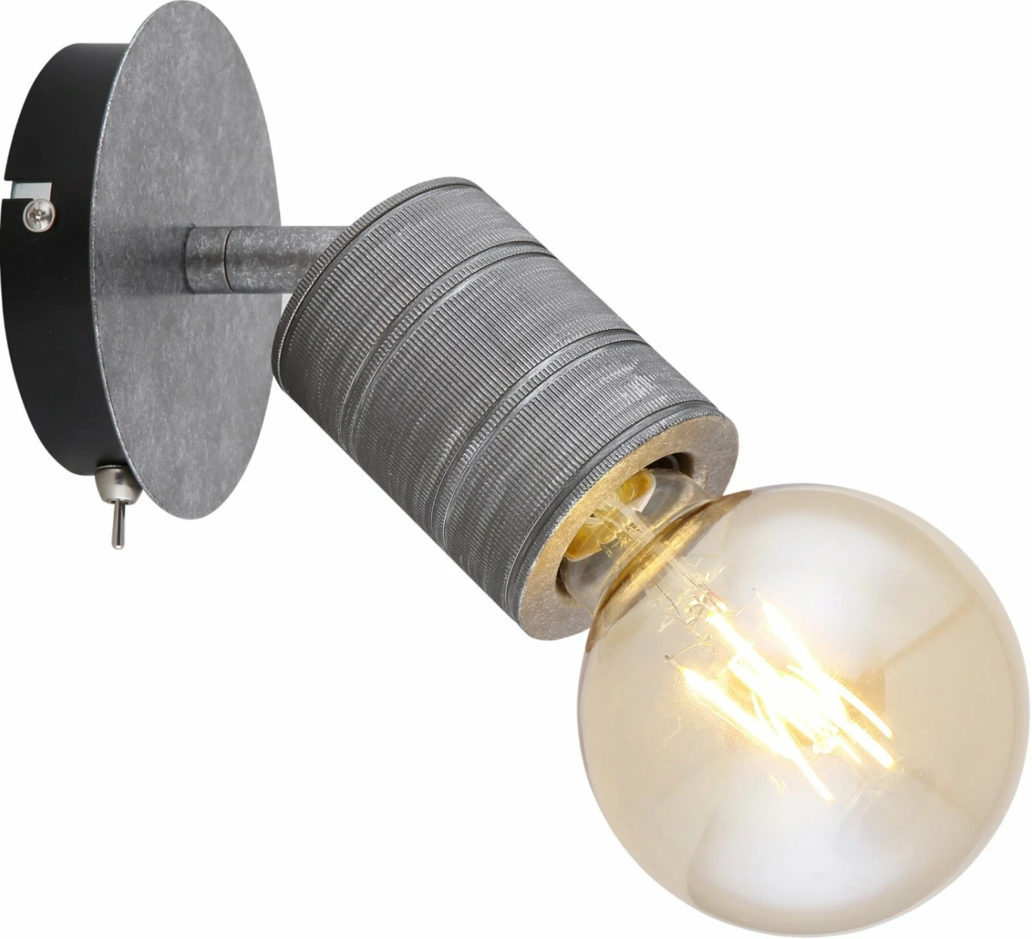 Silberfarbener Wandstrahler im Industrial-Design. Der Strahler kann über einen Kippschalter an- und ausgeschaltet werden. Das gerillte Design macht diese Lampe zu einem Hingucker.